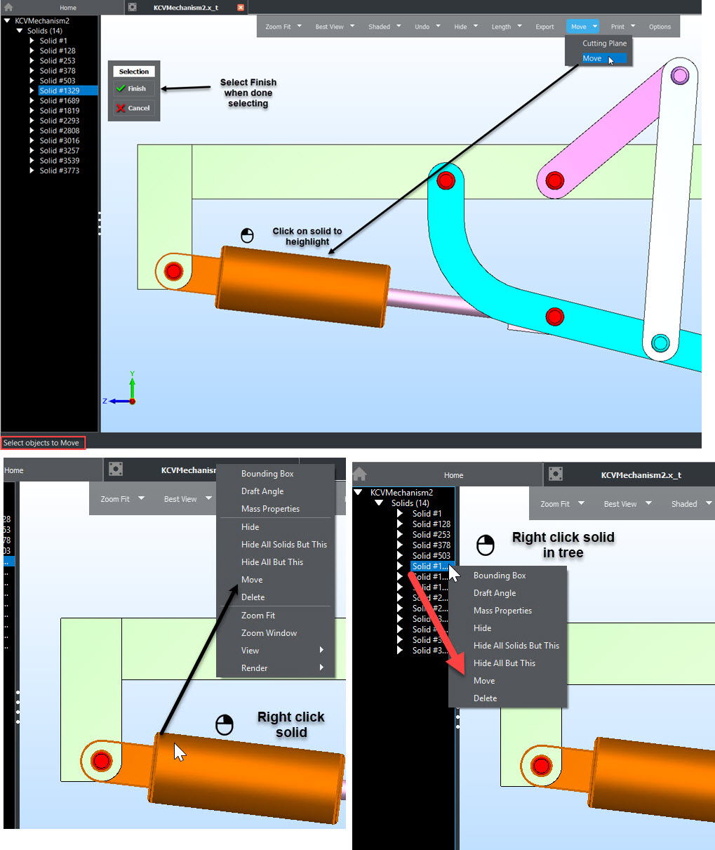 The Move function allows temporary relocation of top level objects (solids for example) for visualization purposes. Undo to reset the Move.