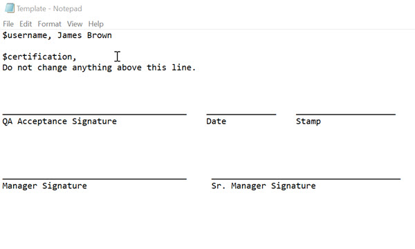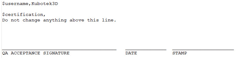 Leave a space after $username, and then enter desired username entry. After $certification, entry start a new line, (hit keyboard Enter) and format as desired. Avoid using any Tab keyboard entries for formating, in above example space bar entries are used to align text under signature lines, (Ctrl + a series of_ dashes were used to create lines). |