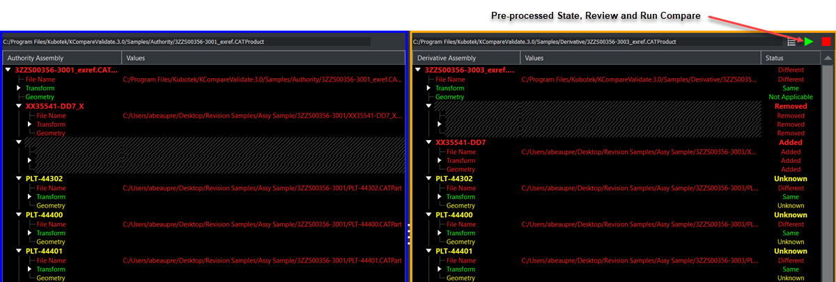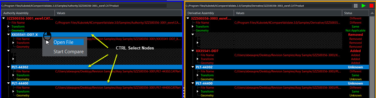 - Target specific file pairs to run Assembly Compare by using Windows Shift or CTRL to pick nodes in paired file list and once highlighted, right click and choose Start Compare or use Run Assembly Compare.Note that choosing top level assembly with this method will run a Compare on all nodes in paired file list.