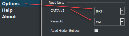 Note: Parasolid and CATIA V5 files will have Export units as set in Options: