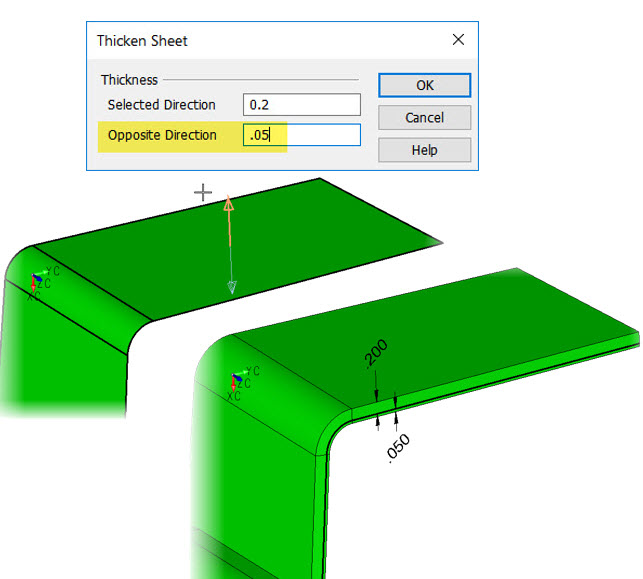 Enter a thickness value for the primary direction (the selected direction after clicking OK). Default value of 0 for Oppsite direction indicates thicken in one direction