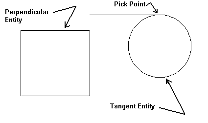 Use this feature to create a line perpendicular to the first selected entity and tangent to the second. Only one entity, however, can be a point. If the points of perpendicularity and tangency are coincident, an error message will appear.