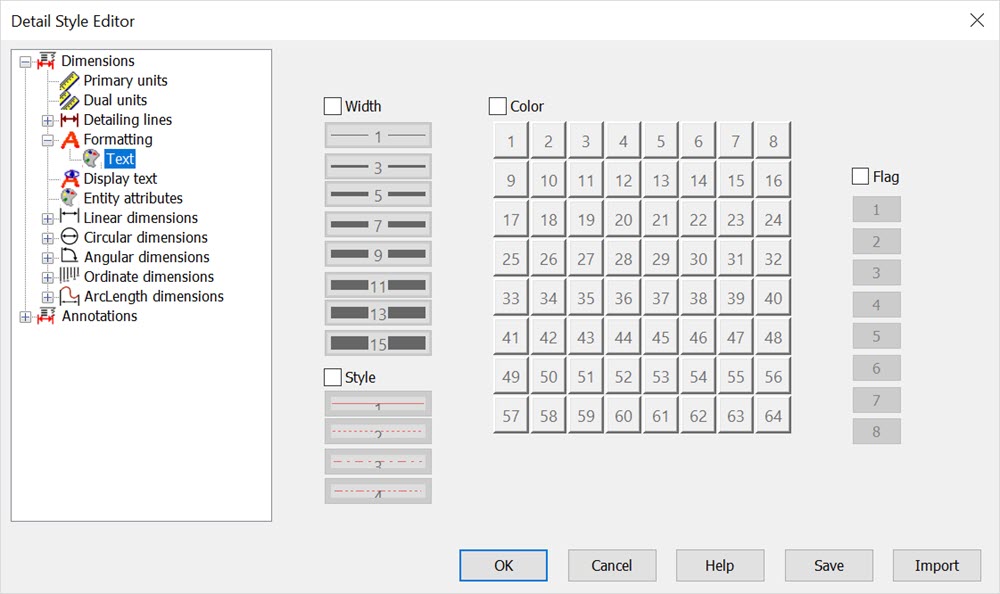 Entity Attributes is a pane, like that shown below, on the Style Editor dialog box that appears when you click the Detail Attributes subnode under Dimensions, Annotations, or dimension subnodes (Dimensions>Linear Dimensions>Entity Attributes, Dimensions>Circular Dimensions>Entity Attributes, etc.)