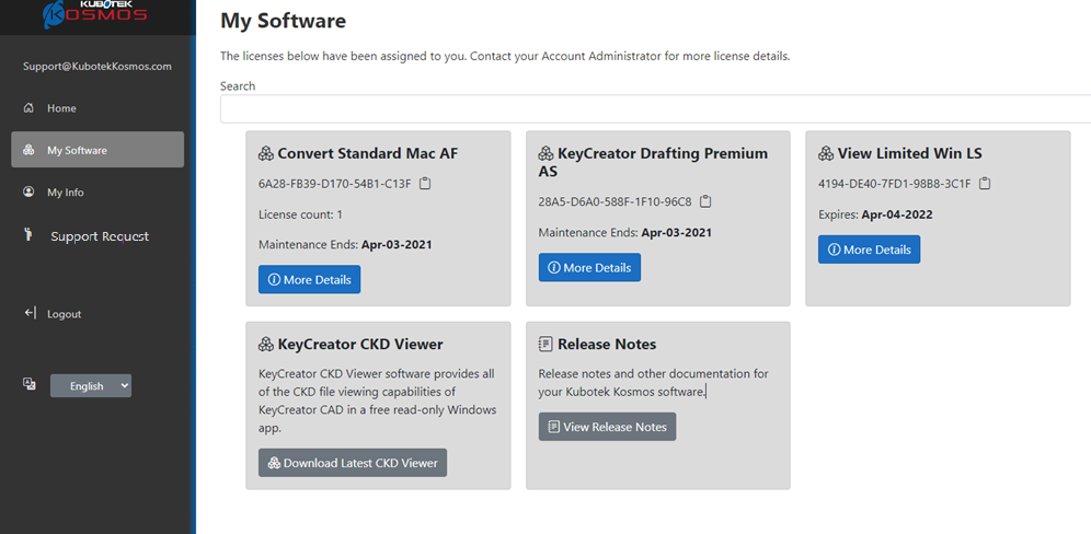 This section is for accessing licenses that have been assigned to you along with additional information such as release notes and available free viewers.