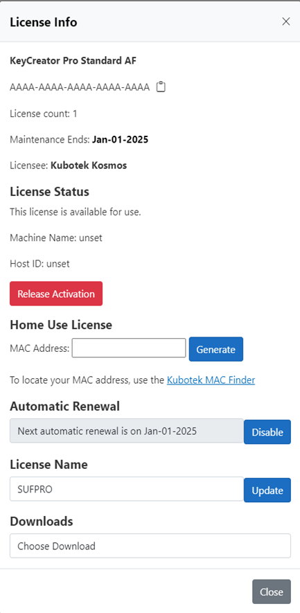 View the automated renewal status of the license. See the ‘Automatic Renewal’ area in the ‘Account Settings’ section for more details.